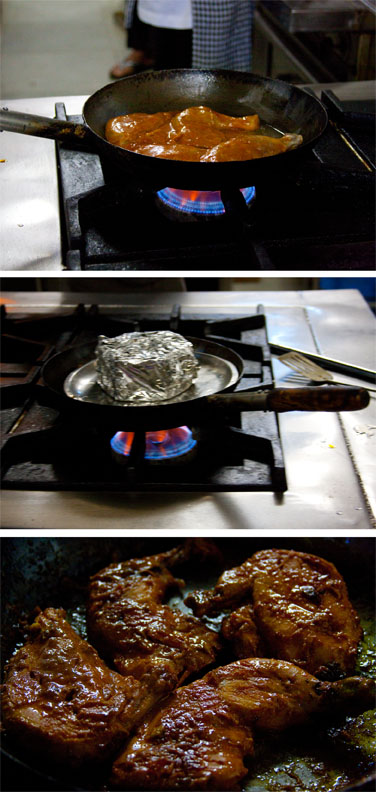 In a large frying pan, pour the oil and heat on a low flame. Once heated, add the chicken pieces into the frying pan and cover with a flat metal plate. Ensure that the plates circumference is smaller than the pan so it sits over the chicken. Take a large metal weight or a heavy vessel such as a iron pestle or a heavy metal bowl filled with water, place over the flat metal plate to weigh down and press the chicken to the frying pan. Roast well on a low flame for about seven minutes. Turn the semi-cooked chicken over and press down with the weight and cook for another seven minutes till well done and the skin has a nice brown roasted color.