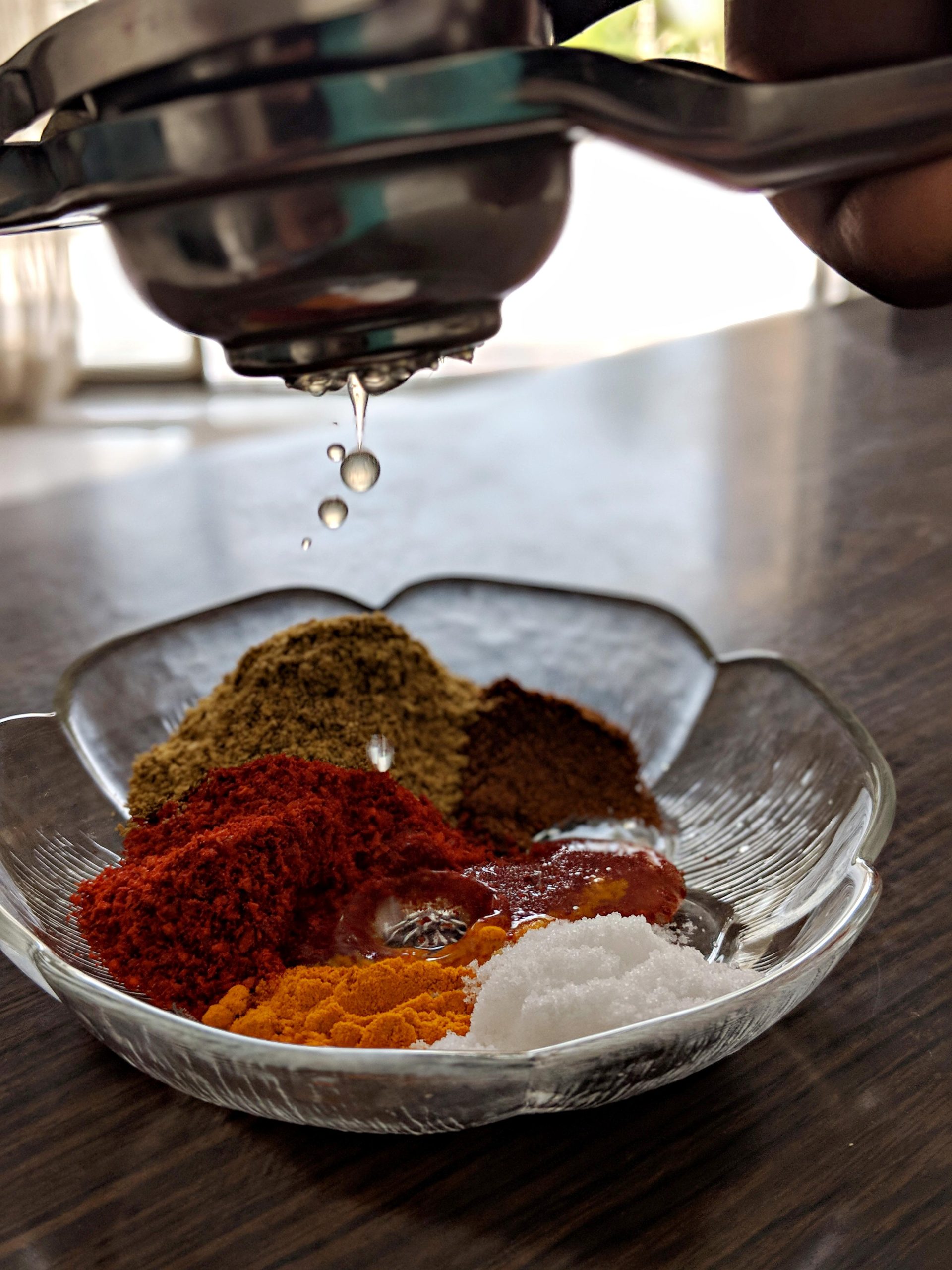 Mix together cumin, coriander, red chili, turmeric, salt and lemon juice to form a paste. No need to add water.