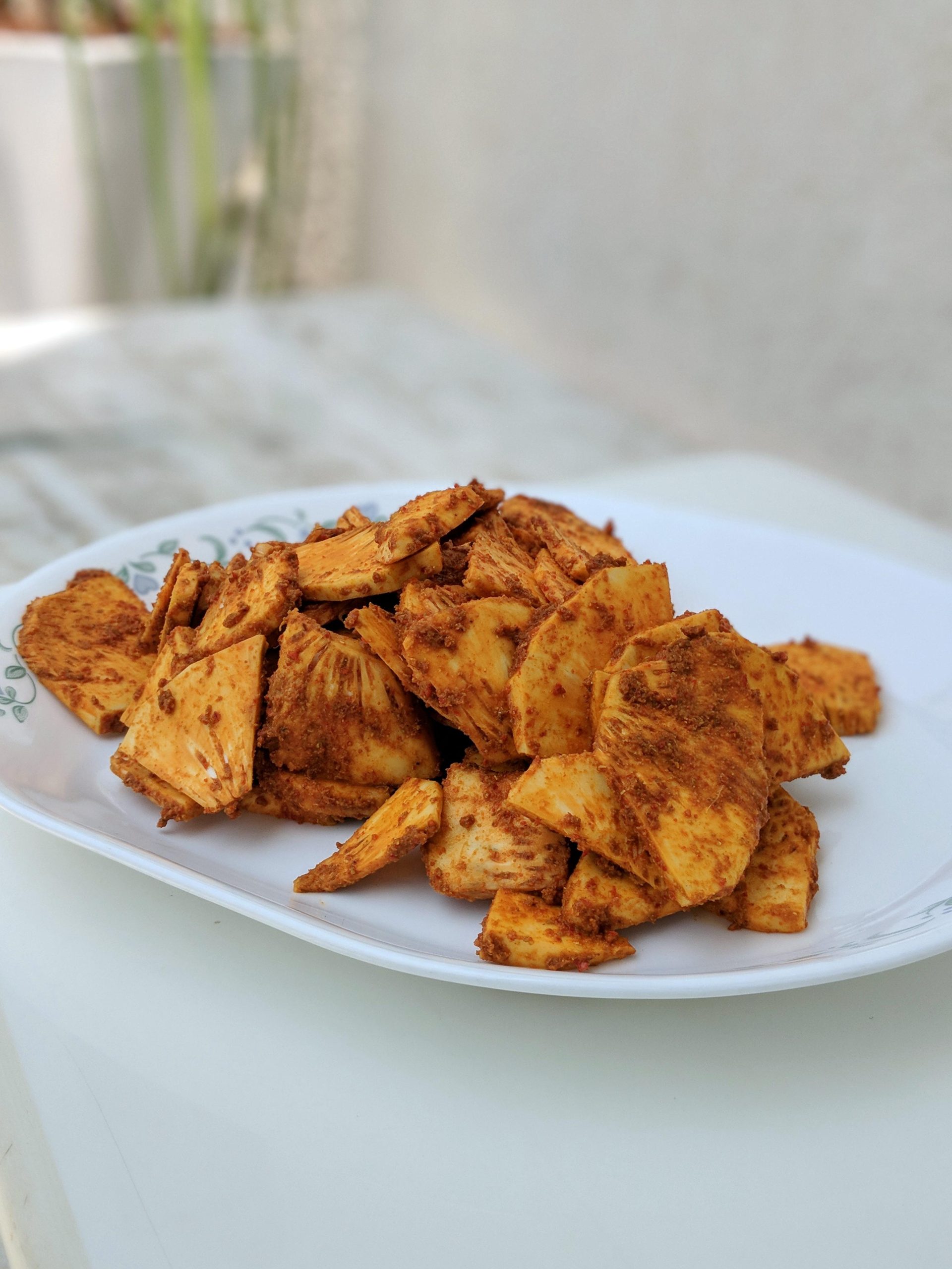 Sangam dropped me a gift of 4 liters of hurrak and a Neer Fanas, both grown on his farm – the day I was leaving. While the airport authorities hungrily eyed the hurrak and decided to take it away (claiming it to be highly volatile even for a check-in) but left me with the fruit (which I was more than happy to chew on raw had they eyed that too). I came back home and made this recipe which is a hybrid of my mothers expert techniques and my cousin sisters excellent Goan cooking. Make this if you get your hands on the (now) coveted breadfruit, or just follow my nonchalant notes for an alternative. This is one dish you will surely ‘finish’