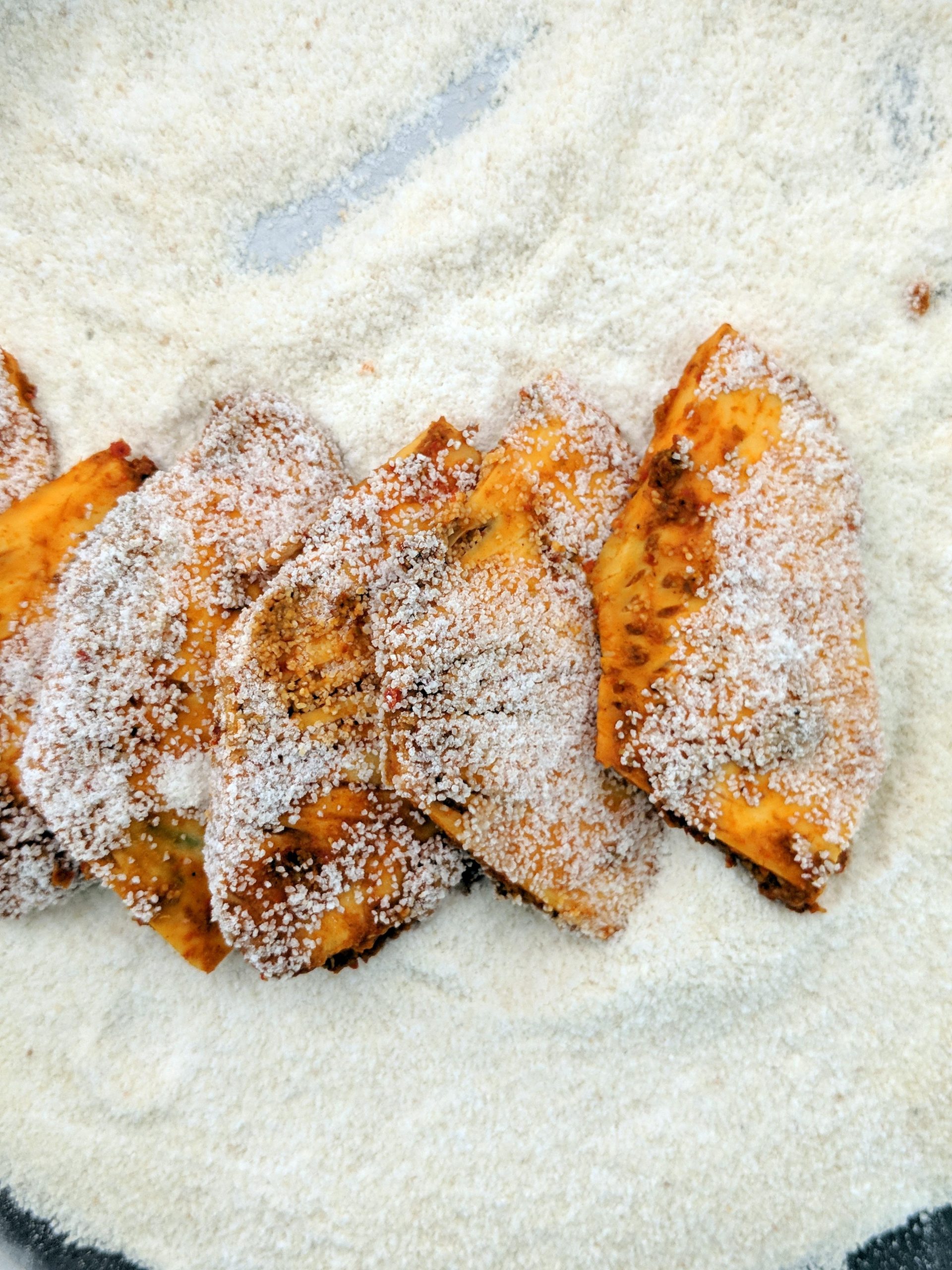 While the original recipe is made using breadfruit, its pretty seasonal and a rare coastal fruit. Available once a year for a very short period. It’s alternate is using vegetables such as eggplant, onion and potatoes all cut into thick discs. Mom used to make this ever so often and it has a nice mellow coconutty element to it along with the crunch. Try it with a variety of vegetables following the same process and you shall have your very own Fodi recipe to fall back on. Trust me, its addictive.