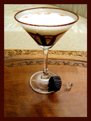 Take the cocktail glass, and with your fingers, rub the rim of the glass with chocolate syrup. Dip the rim in cocoa and stand upright. Pour a spoon of chocolate sauce haphazardly onto the insides of the glass.
