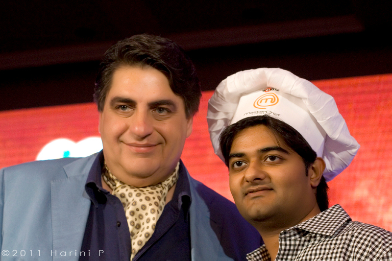 I met with a couple of other bloggers who were chosen to share the spotlight and pooled up with Rushina of A Pefect Bite (who incidentally had a prior opportunity to meet with him when she was visiting Australia on one of her Masala Trails Tours). Apart from that had some of my blogger friends Pranav, Aneesh, Vinda, Arpana & Harini who added to the cacophony of the event. We landed up there on time, made ourselves comfortable gleefully opening up our press handouts, when Aneesh got this bright idea of donning the personalized Masterchef toques. So we did, an enthusiastic bunch, craving Matt’s attention as we sat through the wonderful cook up session he had with Kunal Vijaykar (Having his own Foodie show on TV) our host.