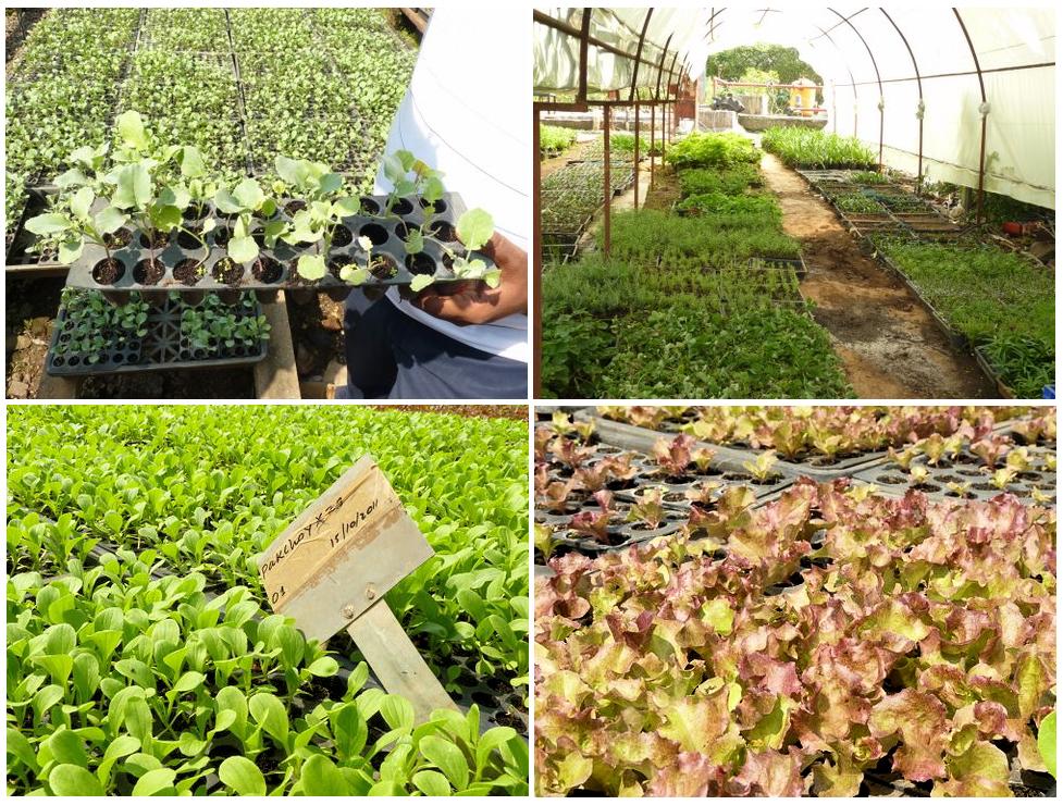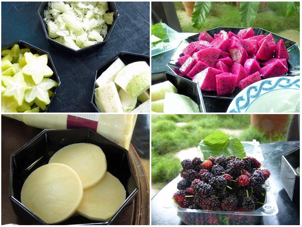 Samar had a plethora of information when it came down to answering queries directed at him while we sauntered from one field to the other. We moved from exotic carambola (starfruit) trees to fig trees, oranges, lemons and kaffir limes wafted a citrine scent which left a heady sense of feeling while passing by. We moved on to fields of dragon fruit which looked like medusa heads popping out in about eleven acres of land, thorny little tentacle plants but with one of the sweetest fruit in the world – shades of pink, white and yellow and taste which left us spellbound. The Trikaya team followed us with tiny little knives picking out and chopping up succulent fruit straight from the overhead branches which we munched on as we traipsed around. Herbed gardens filled with basil, thyme, rosemary and oregano enticed us to break of those fragrant leaves and taste fresh herbs straight off the ground. As we made our way towards the lakeside, heads of lettuce, Brussels sprouts, icebergs and garden greens were heavily laced with cold water in the afternoon sun. Before long we were chewing on raw iceberg like a bunch of hungry rabbits left unattended in the field. Orchids, wild flowers and bonsai made up for the beauty of the unending land, this Trikaya was extremely proud to pot and market. Last but not the least, my ever favorite naga chili plant which was rendered the greenhouse in which it was stored – hot as hell.