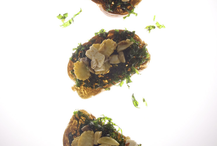 Top each slice of bread with the stir fried spinach, top with the spicy mushroom mix and pop into the oven for a few minutes to heat it up a bit. If serving immediately, toast the bread right before tossing your toppings.
