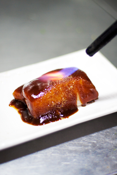The flame licks the marinade hungrily as the sugar and the juice of the fish gets sucked up to the surface, giving it a beautiful caramel glaze with the right amount of burn. It is then popped in the oven for a while to cook evenly and just the right amount to not dry off the fish.