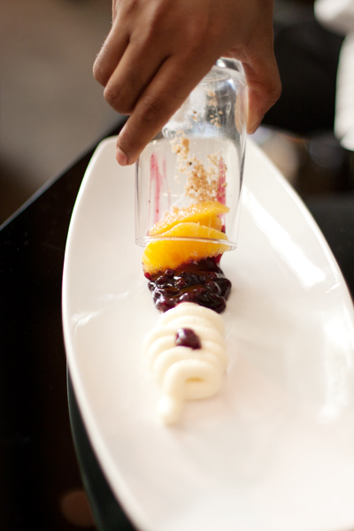 Funnily enough, I have never been inclined towards South East Asian desserts to drop my inhibitions and crave another one. Their gastronomic delight De-Constructed Blueberry Cheesecake takes the cake. Though another signature winner, this is brought to the table in a glass with the layers of a typical blueberry cheesecake intact, beginning with the sweet grainy biscuit layer, followed by tangy citrus fruits, a blueberry coulis like sauce with plump berries and topped off with cream cheese. And if that isn’t enough its swiped off the glass onto a flat plate allowing you to savor all the flavors in one bite OR in various stages ranging from tangy to biscuit-y to creamy to tart.