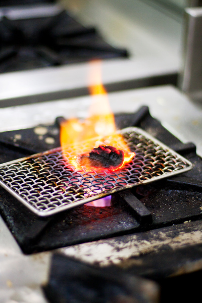 A blow torch (my favourite tool in the kitchen) is flamed up and moved lovingly over the marinade, slowly but steadily.