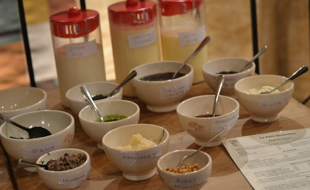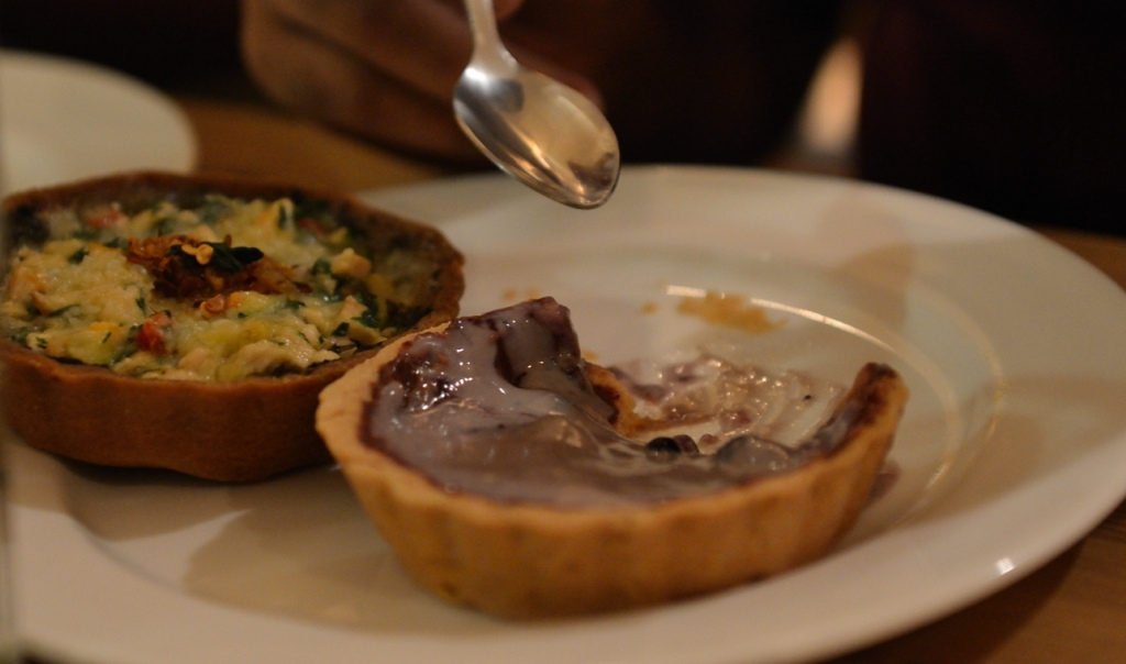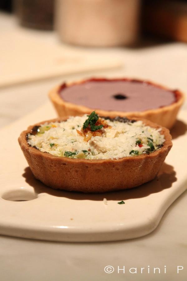 The Mumbai Food Bloggers latest dinner was at a quaint and rustic little restaurant downtown of Mumbai called Le Pain Quotidien. A charming Belgian boulangerie and restaurant which serves up the freshest breads in town matched with an elegant yet easy fare in Mumbai. Rushina, who had planned the dinner around for the bloggers ensured that things got a little interesting and hands-on thus ensuring a ‘contribution’ from each and every ‘member’ of the blogger group. The team of Le Pain Quotidien had set a workstation of sorts for each of us to make our own Tarts. A host of ingredients, fillers and tart shells were laid out on a rustic wooden table and we were left loose to mix, match and create our own tarts.
