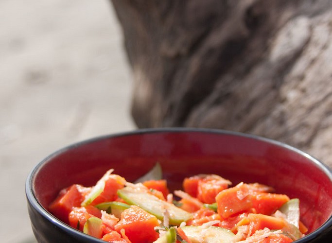 Place the diced papaya and ambarella in a large bowl and toss in the dressing. Toss the salad well and add the grated coconut, toss again and serve cold.