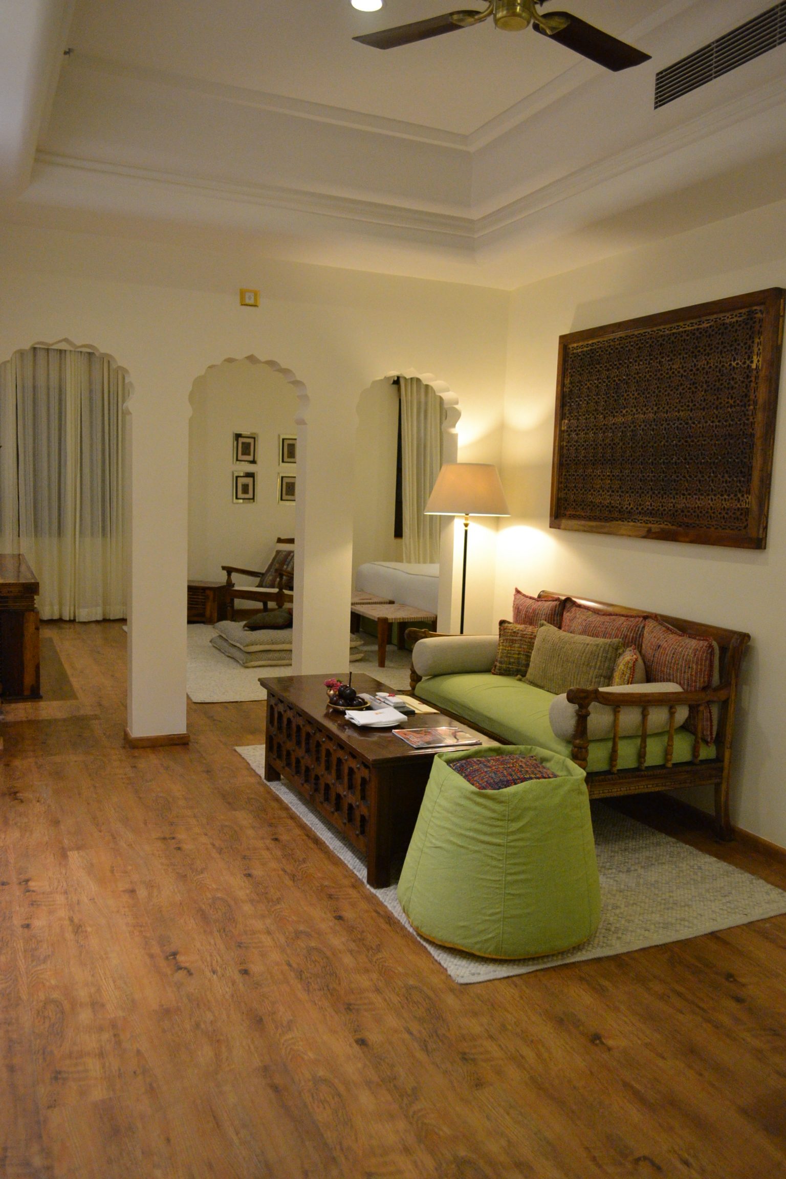 The rooms are well appointed, with a study and a seating area, luxurious beds and spacious lounge areas. Bright pastels and creams with hard natural wood furniture reflect the warmth from the outside walls. The bathroom is expectedly large with an ante chamber for changing and enormous wardrobes, tubs with essences and rubs for your R&R, and modern rain showers along with ‘his’ and ‘hers’ basins. Theres enough seating to plonk yourself like a moody Maharaja who has a sudden desire to sit down at an unexpected space and have a large pillow strategically placed there.