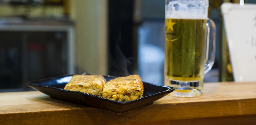We walked into a small little restaurant on the Pontocho street which was run by this young chef with his partner (they both barely spoke a word of English but it was not difficult getting our orders placed and fresh cold beers poured out). This place sounded like it made some amazing Kansai- or Osaka-style okonomiyaki and we were not wrong. We were served their local Sapporo beer on tap with a serving of soft, warm and melt-in-your-mouth tofu delicately sauced with soy and spring onions (Starting with a vegetarian dish, can you imagine!) while the boys pottered about slicing up fresh cabbage for our Okonomiyaki omelette (the time was 1am). They whisked a batter made of flour, grated nagaimo (a type of yam – some of the names as we later learnt when we went to Nishiki market cost up to Y10,000 per yam), water or dashi, eggs and shredded cabbage.